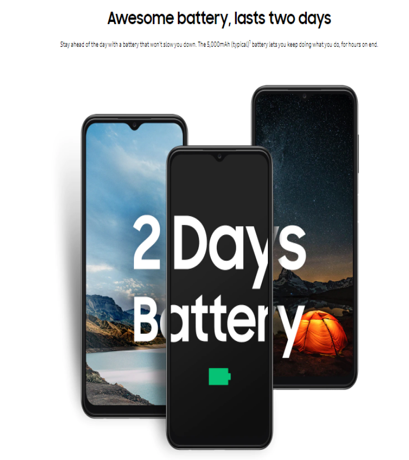 - NETWORKTechnologyGSM / HSPA / LTELAUNCHAnnounced2022, March 04StatusAvailable. Released 2022, March 23BODYDimensions165.1 x 76.4 x 8.8 mm (6.5 x 3.01 x 0.35 in)Weight195 g (6.88 oz)BuildGlass front (Gorilla Glass 5), plastic frame, plastic backSIMSingle SIM (Nano-SIM) or Dual SIM (Nano-SIM, dual stand-by)DISPLAYTypePLS LCDSize6.6 inches, 104.9 cm2 (~83.2% screen-to-body ratio)Resolution1080 x 2408 pixels, 20:9 ratio (~400 ppi density)ProtectionCorning Gorilla Glass 5PLATFORMOSAndroid 12, One UI 4.1ChipsetExynos 850 (8nm)CPUOcta-core (4x2.0 GHz Cortex-A55 & 4x2.0 GHz Cortex-A55)GPUMali-G52MEMORYCard slotmicroSDXC (dedicated slot)Internal32GB 3GB RAM, 64GB 4GB RAM, 128GB 4GB RAM, 128GB 6GB RAM